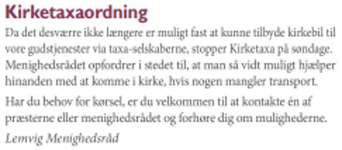 Fra 1. august 2018 udvides kirketaxaordningen til også at omfatte kørsel til Kirkens Dagligstue og Foredragsaftener i kirkehuset, Lemvig – samt til arrangementer, der afholdes i kirkehuset direkte efter gudstjenesten i Lemvig kirke.