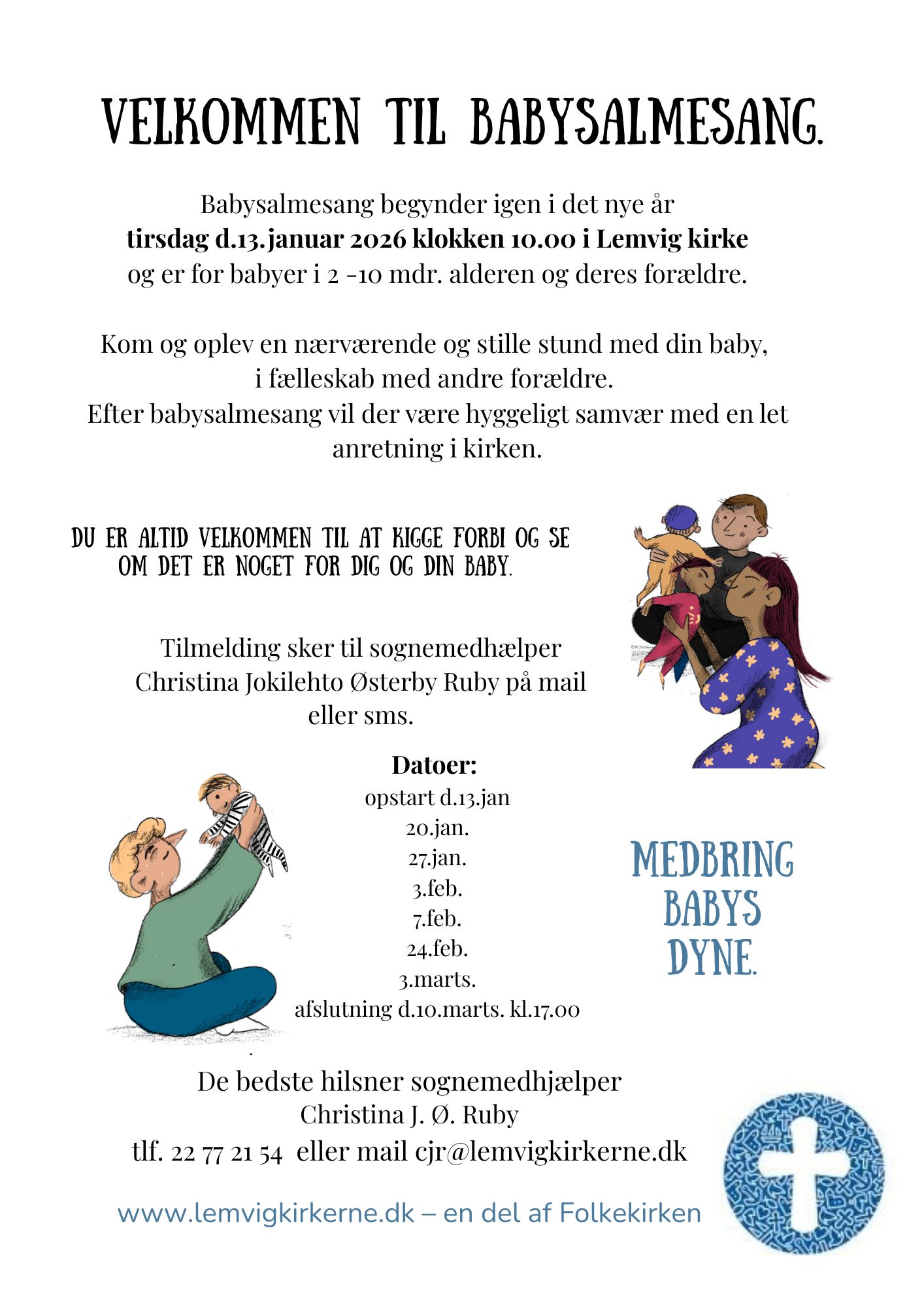Nyt hold starter 13. januar 2026 kl. 10.00 i Lemvig KirkeLæs mere om babysalmesang